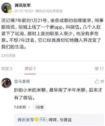 2010年末,小米在安卓市場(chǎng)發(fā)布米聊,2011年1月,微信測試版正式上線(xiàn)。相似的聊天內容,以及晚了一步的上線(xiàn)時(shí)間,讓微信備受“抄襲”米聊的指責。對此,騰訊公關(guān)總監張軍曾在微博以“呵呵,你真逗”進(jìn)行了否認。