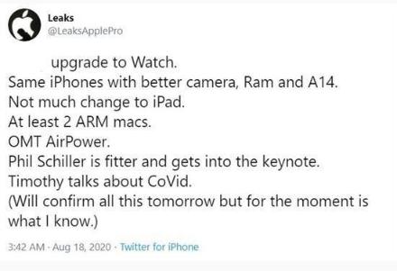 據知名爆料達人@LeaksApplePro 最新在 Twitter 上發(fā)布的消息顯示,全新的 iPhone 12 的相機將比以往更強大,同時(shí)還會(huì )增加運存,且將全系搭載 A14 芯片,并且至少會(huì )發(fā)布兩款基于 ARM 的 Mac 產(chǎn)品,而此前被砍掉的無(wú)線(xiàn)充電板 AirPower 這次也將重新與大家見(jiàn)面。除此之外,此前還有消息稱(chēng)全新的 AirPods Studio、HomePod Mini、AirTags 以及新款 Apple TV 都有可能隨之亮相。