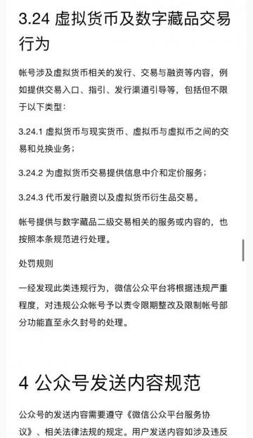 《微信公眾平臺運營(yíng)規范》新增了“虛擬貨幣及數字藏品交易行為”條目,稱(chēng)帳號若涉及虛擬貨幣相關(guān)的發(fā)行、交易與融資等內容,例如提供交易入口、指引、發(fā)行渠道引導等,“一經(jīng)發(fā)現此類(lèi)違規行為,微信公眾平臺將根據違規嚴重程度,對違規公眾帳號予以責令限期整改及限制帳號部分功能直至永久封號的處理。”