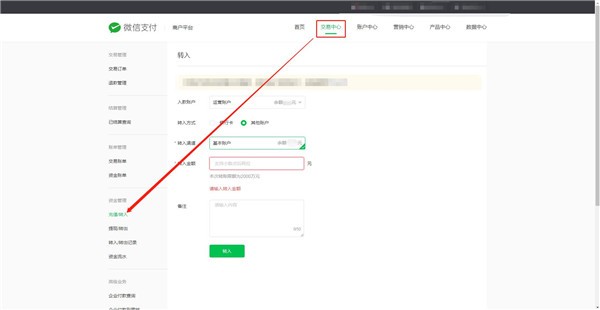 2.進(jìn)入到支付平臺后,點(diǎn)擊橫向菜單的交易中心,然后在左側菜單中點(diǎn)擊充值/轉入,就可以看到操作頁(yè)面了