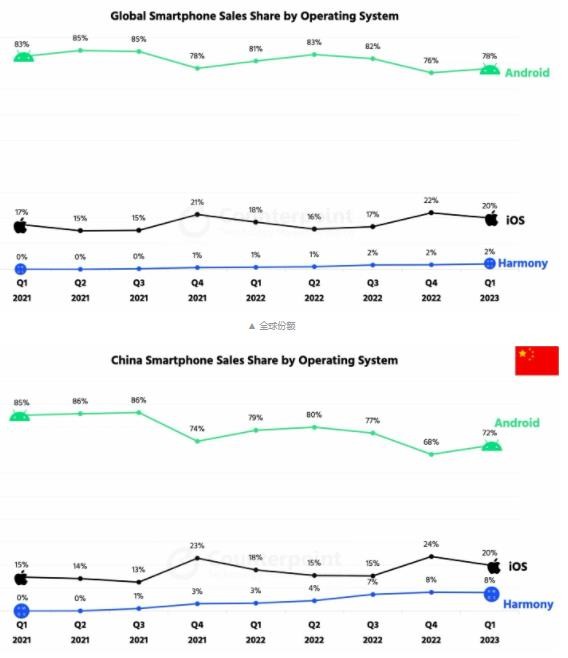 研究報告顯示,華為 HarmonyOS 系統的份額一直在增長(cháng),2023 年第一季度在全球市場(chǎng)的份額維持在 2% 左右,而在中國的份額達到了 8%。