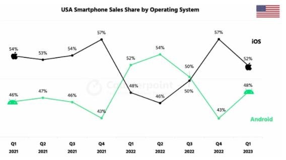 在美國市場(chǎng),iOS 和安卓市場(chǎng)份額互有勝負,而今年第一季度 iOS 以 52% 的份額暫時(shí)領(lǐng)先。