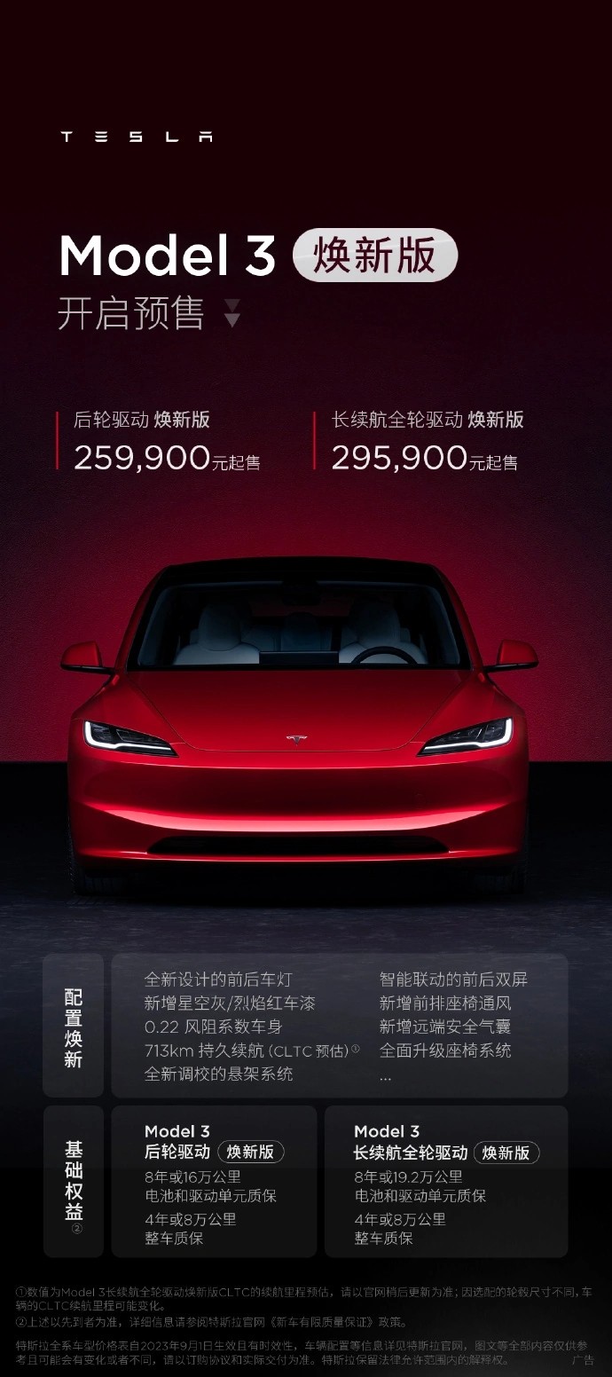 新款 Model 3 車(chē)型上架特斯拉官網(wǎng):25.99 萬(wàn)元起售,第四季度交車(chē) 10:06:05