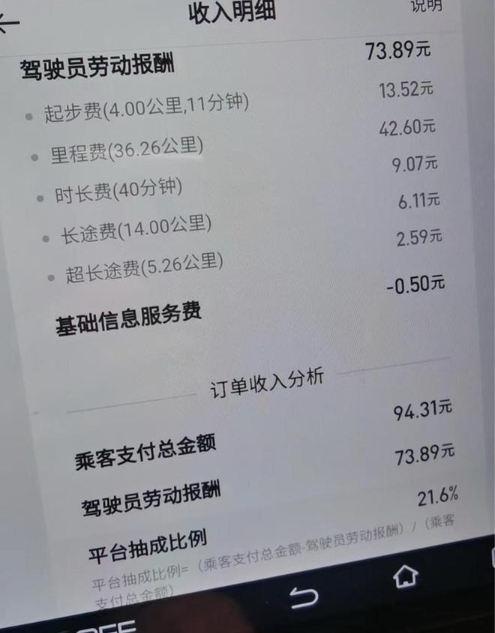 記者在采訪(fǎng)中了解到,有平臺為了吸引客源發(fā)放的優(yōu)惠券,最終也都轉嫁到了司機身上。劉師傅是“曹操出行”的簽約司機,不久前,一個(gè)距離 40 公里左右的訂單,抽成后他只收到 73.89 元。“均下來(lái)每公里 1.8 元,但平臺顯示抽成比例只有 21.6%。我一問(wèn)乘客,才知道他領(lǐng)了優(yōu)惠券,這種低價(jià)訂單越來(lái)越多,豈不是意味著(zhù)平臺的折扣最終還是讓司機來(lái)承擔?”