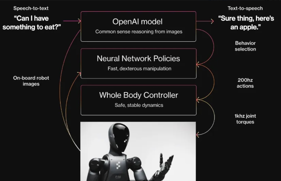 除了視覺(jué)以外,Figure 02也搭載了公司投資人OpenAI專(zhuān)門(mén)定制的語(yǔ)音到語(yǔ)音推理模型,通過(guò)機載麥克風(fēng)和揚聲器與人類(lèi)進(jìn)行對話(huà)。愛(ài)德考克也透露,這個(gè)機器人的默認UI是語(yǔ)音。